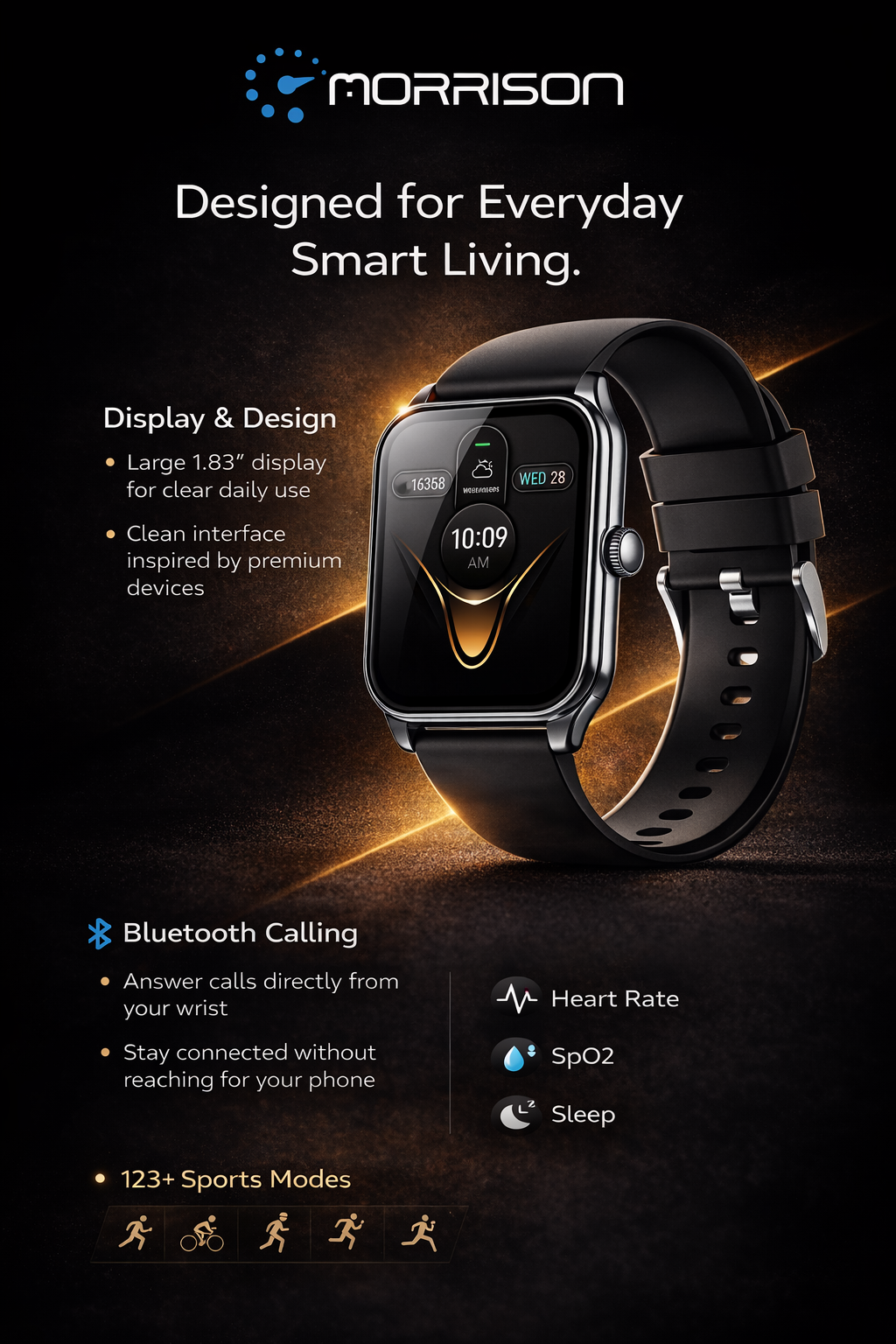 Morrison smart watch features a 1.83-inch HD display, IP68 waterproof design, Bluetooth calling and music, 123+ sports modes, and advanced health monitoring including heart rate, blood oxygen, and sleep tracking. Stylish, lightweight, and perfect for daily wear and fitness.
